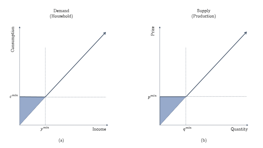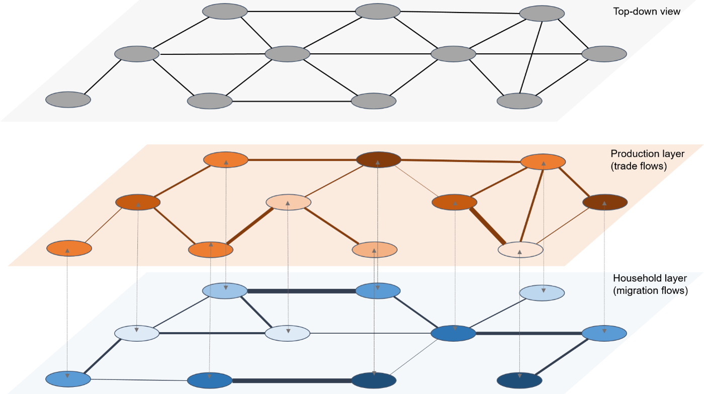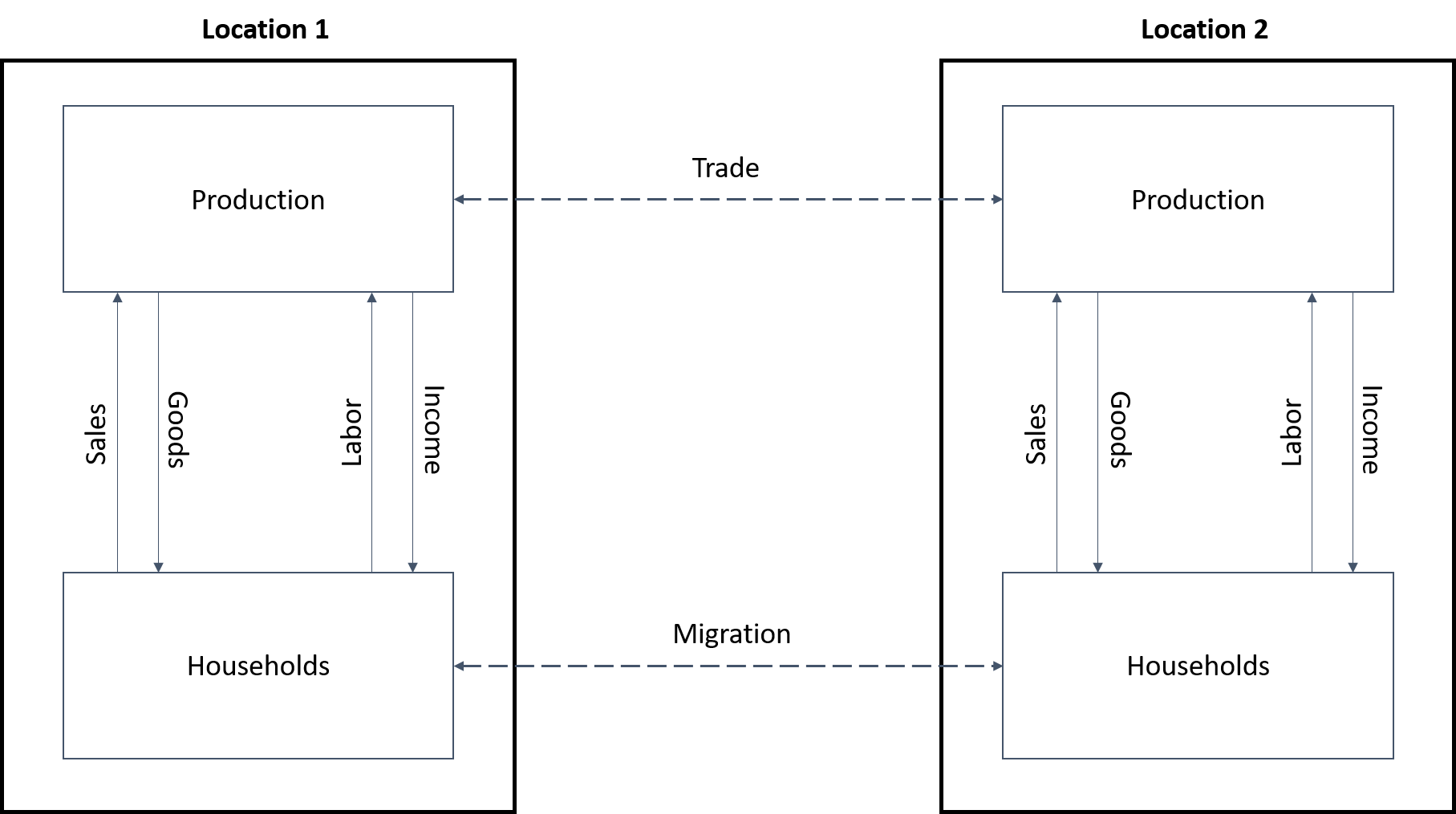 - Households allocate income between essential and non-essential goods, supply labor locally, and migrate if they can no longer meet minimum consumption thresholds.